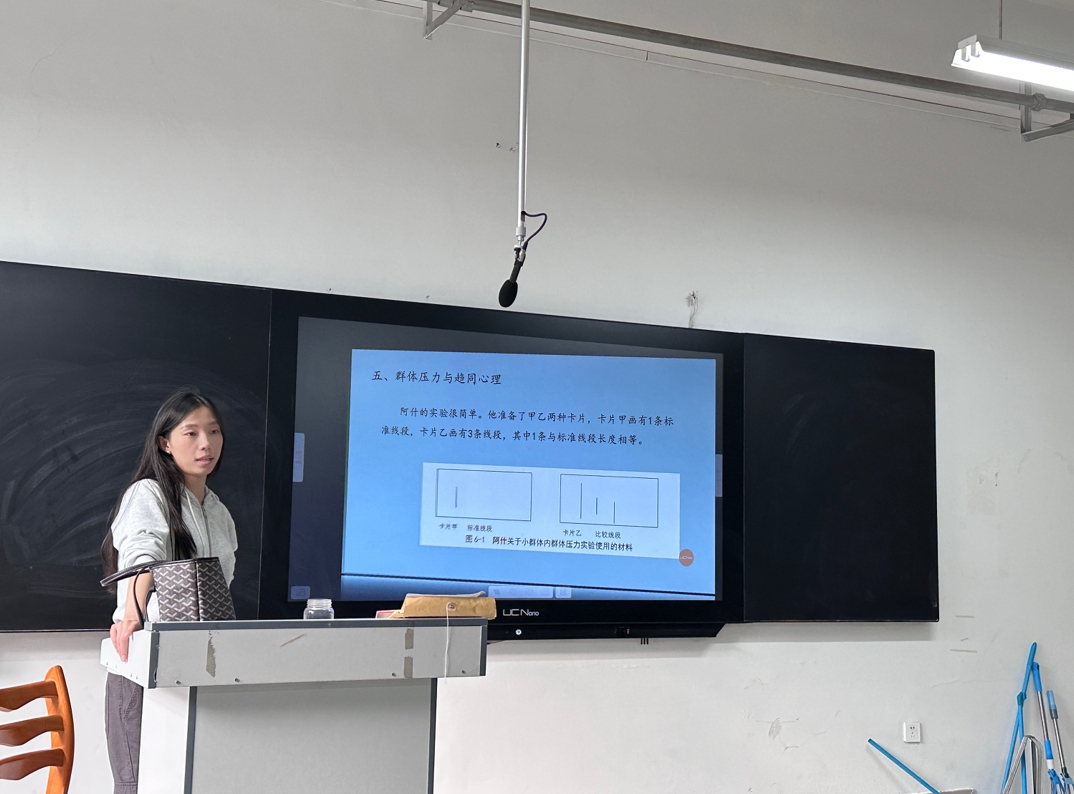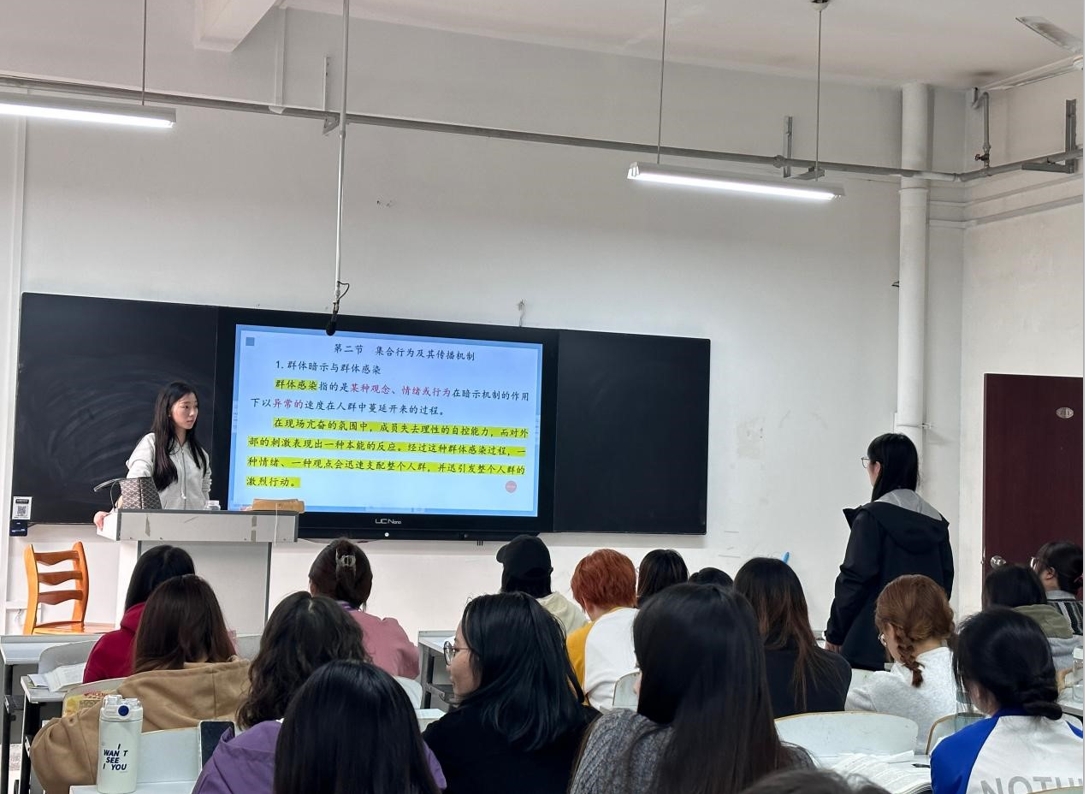 10月23日下午,在H11教室,文传学院专职教师丁宇薇正在给21级广告1班的学生讲授《传播学概论》这门课程。本堂课以突出教学重点——“群体传播、集合行为、组织传播”为核心,重点梳理了群体意识、群体规范、群体压力与趋同心理等相关概念。课堂上,丁老师根据学生学情,采用寓教于乐的方式,将抽象的传播学相关概念进行生动、具象地讲述,成功完成了教学任务。
