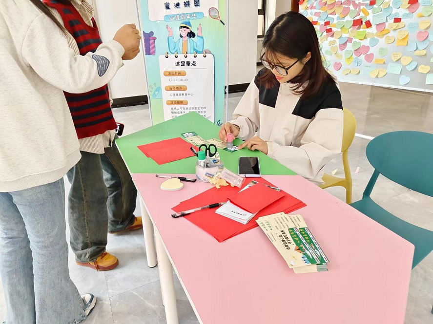 为了培育健康心灵,守护美好未来。我院举办2023年心理嘉年华“宣泄拼图”活动。本次活动共历时5天,吸引了许多同学的参与,参与活动的同学可以在便签或彩纸上写下自己的心声,并按自己的想法进行裁剪,最后将其粘贴在展板上。在活动开始前,我院心理部协调各班级心理委员及部门干事进行活动流程培训,在活动中,心理部秉承“奉献友爱,互助进步”的精神,积极地为每一位到来的同学讲解活动流程,解答他们的疑惑。