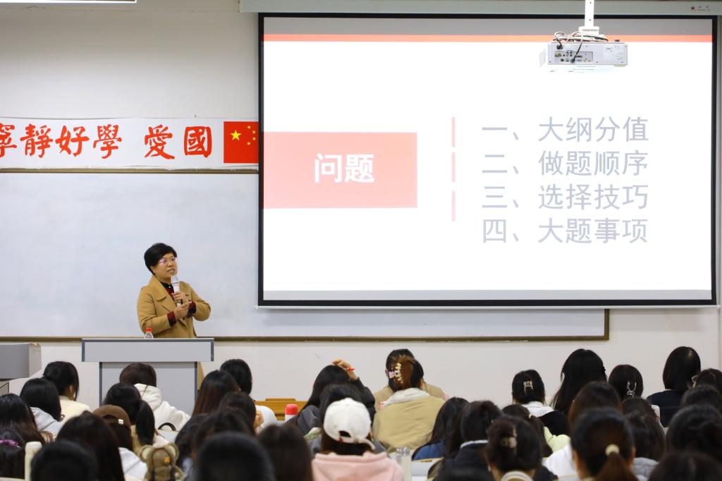 李小林老师围绕考研政治展开论述,从政治出题的方向、解题思路及答题技巧等方面作了详细解析,强调在当下考研冲刺阶段应关注时政热点,并通过热点分析进一步了解政治试卷出题方向,嘱托同学们提前熟悉考试流程,掌握答题速度,勤加练习,从而更好地答题。外语学院王静老师针对考研英语分析了考研大纲、做题顺序、专项技巧及注意事项,为考研学子指明了冲刺复习方向,使同学们更加自信地面对考研。
