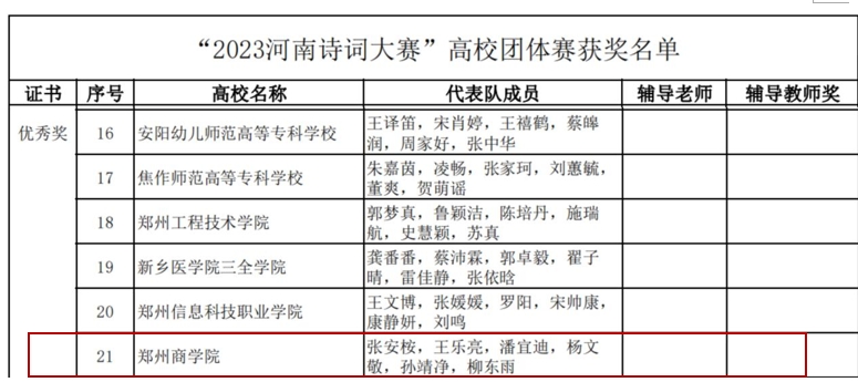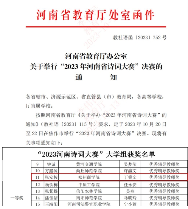 2023年10月20日至22日,河南省诗词大赛决赛在焦作市举行。经过报名、海选、初赛、复赛层层选拔,共有115名大学生晋级省级决赛的个人赛,48所高校进入省级决赛的团体赛。点点官网文学与新闻传播学院汉语言文学专业杨文敬、张安桉、王乐亮、孙靖净、潘宜迪、柳东雨六位同学,在丁箐文、张红敏两位指导老师的带领下,赴焦作参加大学组个人赛和高校团体赛的省级决赛,经过激烈角逐,张安桉同学荣获个人赛一等奖,并获得了央视2024中国诗词大会的面试机会。