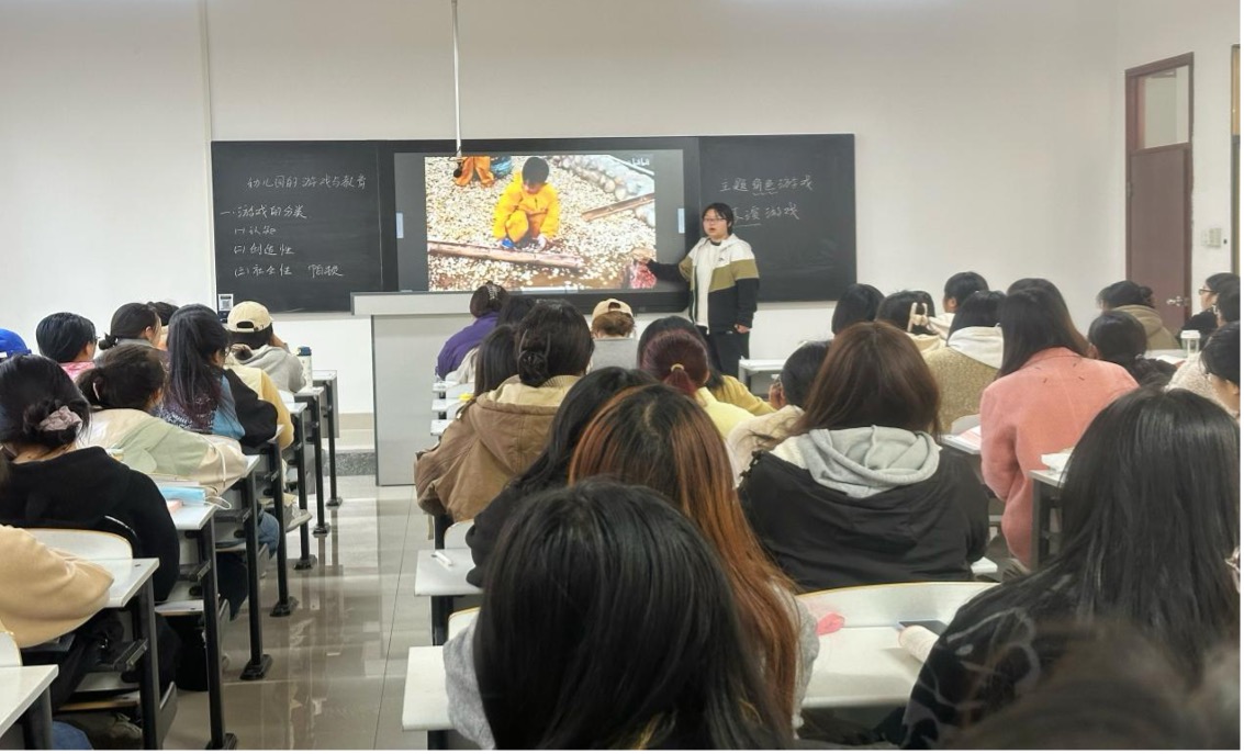 12月7日上午,在H206教室,文传学院专职教师吉宇正在为21学教1、2班的学生讲授《学前儿童游戏理论与指导》这门课程。该课程是学前教育专业的核心课,也是理论性与实践性并重的一门课程。因此,在授课过程中,吉宇老师采用讲授法、讨论法、游戏法、分小组案例展示等多种教学方法,帮助学生掌握相应内容。本堂课主要讲述了“幼儿园的游戏与教育”,吉宇老师重点围绕“幼儿园游戏的分类”进行讲述,并结合游戏与幼儿园教育的关系等内容,引入国内知名的游戏形式“安吉游戏”、“利津游戏”,丰富课堂的内容,拓宽学生的视野。