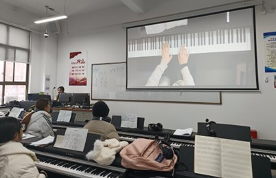 张老师的课堂充满了灵活性和趣味性,在讲完每一个知识重难点之后,都会带领学生进行实践练习,为深入推进理论与实践相结合,教学方案与策略设计注重学生的实践操作和实际应用,将理论知识与实际相结合,提高学生的动手弹奏的能力,张老师关注学生在知识、技能、情感态度等方面的全面发展。在讲完右手的节奏与旋律之后,张老师让学生进入了短暂的练习环节,让学生把知识点和自己的理解充分结合,让学生加深印象,进而可以更好的引入踏板的使用方法这一难点。在讲完左手弹奏方法之后,张老师加上动作示范,让学生通过示范更直观的观察演奏方式。