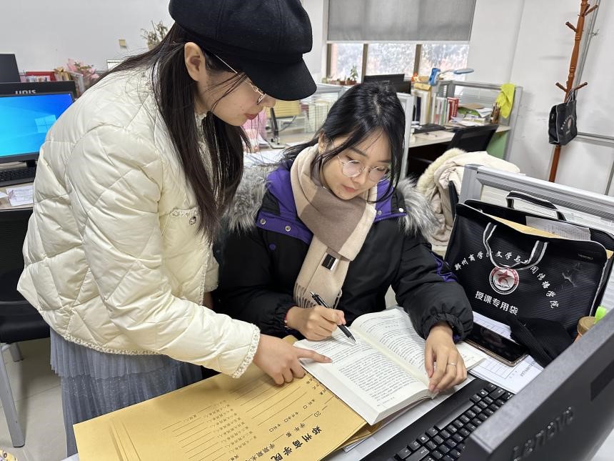 文学教研室陈静老师和赵卓老师讨论期末试卷