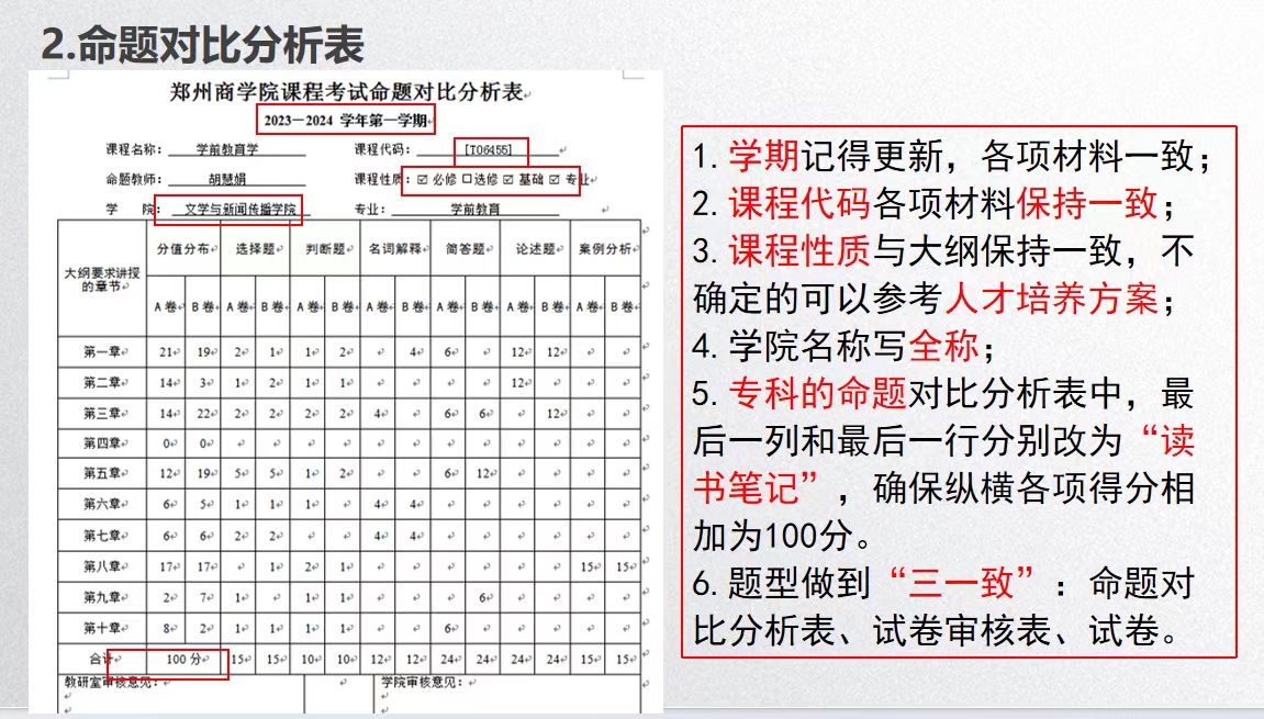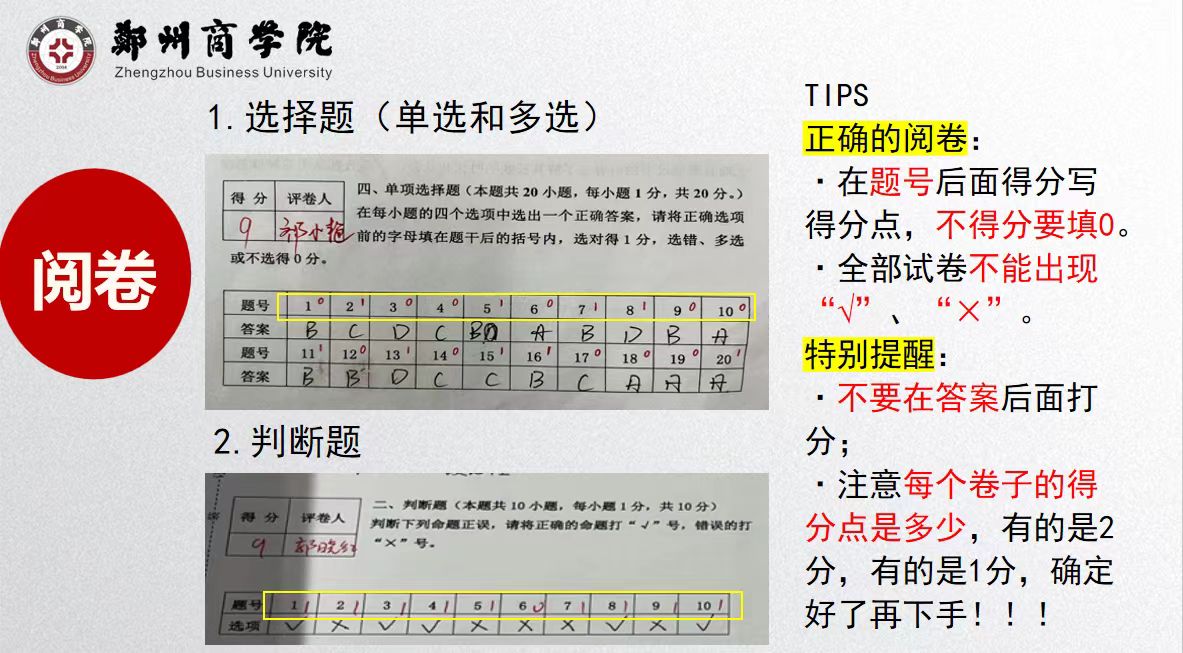 教学质量监控督导员胡慧娟进行考试规范专题培训。胡老师从试卷批阅及归档规范、成绩录入规范、监考工作规范三个方面,传达了学校教务处相关要求。一是试卷批阅及归档规范,胡老师针对考试课与考查课,从试卷批阅到归档,结合以往检查中各项材料中的易错点,通过图文并茂的形式,指出了各环节的注意事项;二是成绩录入规范,胡老师重点强调了要把准时间节点,规范录入流程,做好录入审核,切忌出现漏录、错录的情况;三是监考工作规范,胡老师提醒各位监考老师严守监考规范,特别是在监考时间、考试资格审核、违纪学生处理流程上要知规守规,严于律己,坚守底线。