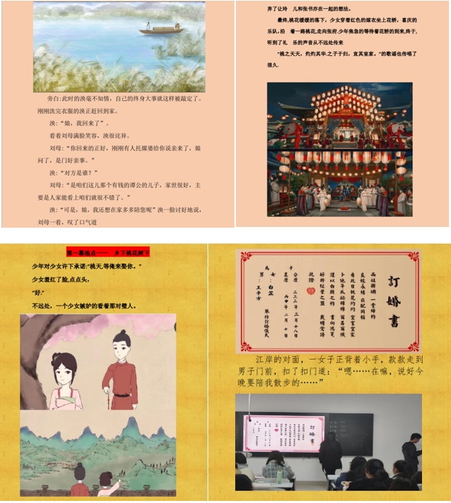 再如马若晗老师所教课程《中国古代文学I》,本学期主要讲授先秦文学,其中《诗经》为重点内容,为了使同学们更好地理解《诗经》作品的主旨内涵,马老师鼓励同学们将诗歌改编为情景剧进行创作,全班分为六个小组,每组8-10名同学,合力完成情景剧创作,通过小组演出形式展示,最终挑选优秀作品,配以插图汇编成册。既加深了同学们对于《诗经》作品的理解,也锻炼了同学们的创作改编能力,同时还丰富了课堂教学及课后作业形式,取得了显著效果。