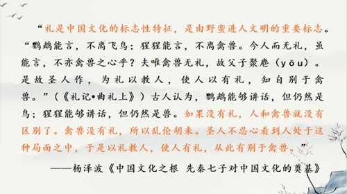 儒学文化中的“礼”文化是我国传统文化的重要组成部分,在当下依然具有强烈的时代价值,通过感知孔子关于“礼”“仁”两概念的思想内容,能够帮助学生建立起孝敬父母、尊敬师长、诚信友善、严于律己的道德品质,在此过程中弘扬社会主义文明、和谐、诚信、友善的价值观念,引领学生健全人格的养成。