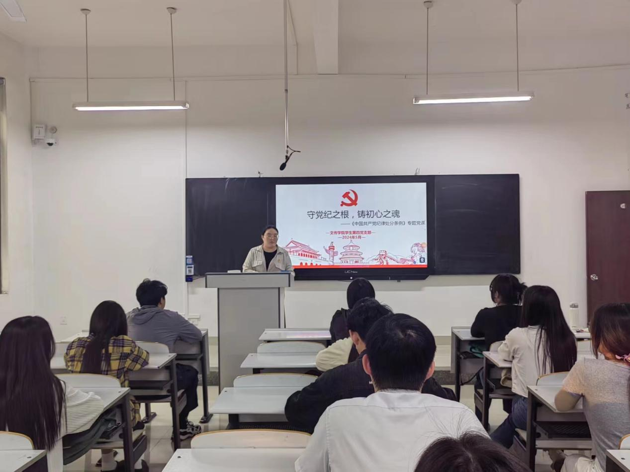 为了深入开展党纪学习教育,引领全体党员学纪、知纪、明纪、守纪,不断加强作风建设。5月8日,文传学院学生第四党支部在自力楼207教室召开以“守纪律之根,铸初心之魂”为主题的《中国共产党纪律处分条例》专题党课,旨在教育引导党员干部及积极分子的纪律意识和党性修养。