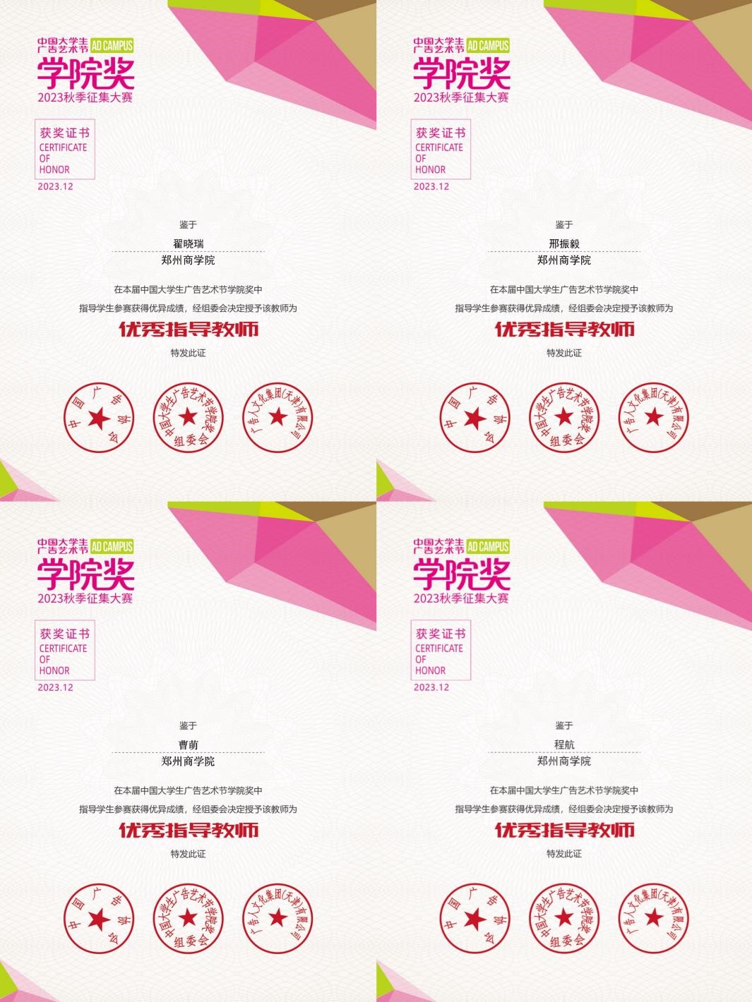 近日,从中国大学生广告艺术节学院奖组委会传来佳讯,点点官网文传学院学子在学院奖秋季赛中共斩获三等奖1项、优秀奖11项、入围奖26项。参赛团队指导教师翟晓瑞、邢振毅、曹萌、程航荣获“优秀指导教师”称号。
