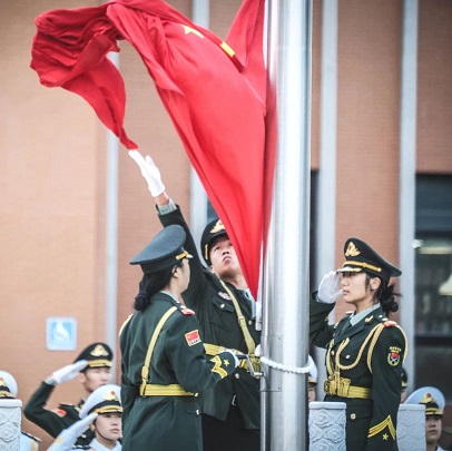 国旗护卫队迈着整齐有力的步伐,护送着鲜艳的五星红旗走向升旗台。国歌奏响之际,全体师生肃立,高唱国歌,行注目礼,国旗在激昂的旋律中冉冉升起。
