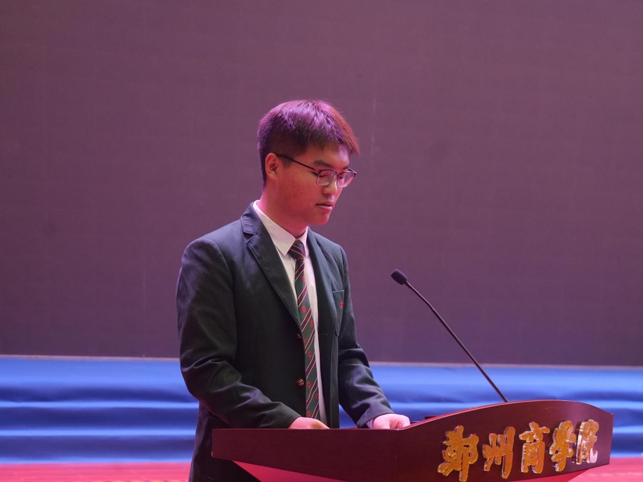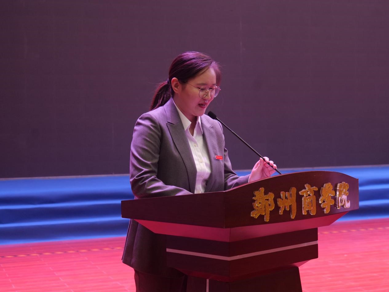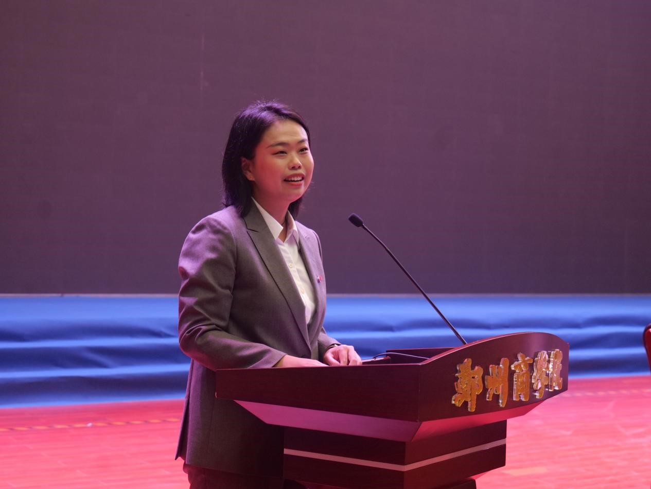 党委书记贾蓓致辞,代表学院向全体2024级新生表示热烈欢迎,青春洋溢的新生学子加入郑商这个大家庭,为学校增添了无限的活力与希望。她对新生们提出了四点寄语:一是不忘初心,加紧学习;二是多读书、读好书、积极写作;三是主动转换身份角色;四是脚踏实地,具有实干精神。希望同学们珍惜大学美好时光,谨记“勤俭朴实、自力更生”的校训精神,勇敢逐梦,收获满满。