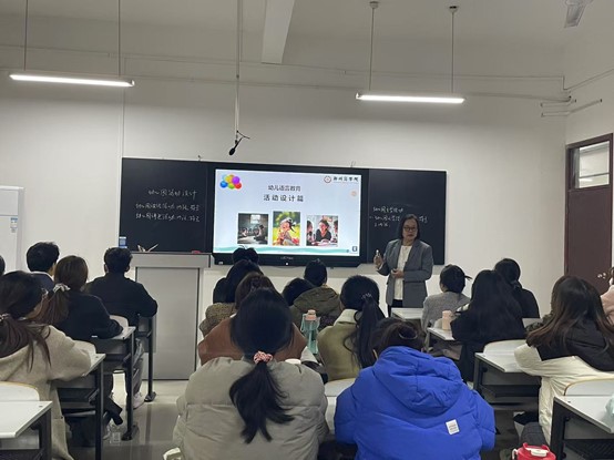 10月30日第5节在H306教室,文传学院教育学教研室的杜友莉副教授为24专升本3班讲授《幼儿园讲述活动》课程。在本节《幼儿园讲述活动》课中,杜友莉老师围绕“讲述活动设计”中的“目标”设定展开教学。“目标”设定是幼儿园讲述活动设计的首要任务,关乎整个讲述活动的开展,她结合案例《小猫的一天》《一个苹果的故事》《农夫该不该等兔子》等案例,进行课堂讨论、带领学生共同剖析幼儿园谈话活动与幼儿园讲述活动的区别,明确了幼儿园讲述活动的三维目标设定要求,并针对不同类型的 “幼儿园讲述活动”,帮助学生掌握“目标”设计技能。课堂上,师生互动,营造了生动的课堂氛围。