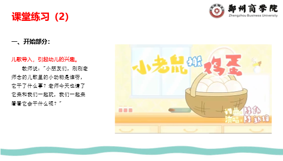 杜老师的课堂氛围活跃,充满着感染力,学生始终能跟随老师的思路进行思考,课堂上师生粘合度较高。通过“目标”设定的知识讲述,通过课堂讨论分析和随堂练习,使知识在学生愉悦的氛围中被感知吸收。紧随幼教时代前沿的专业素养,向学生展示了幼儿教育为党育才的教育方向,杜老师在课堂上展示了深厚的专业综合能力,学生的思维裂变是有条件的,“立德树人”从来都不是一句空话,只有丰富的知识积累和反复的理论实践,才能够使杜老师的课堂,变成自己学生思维裂变的大舞台。