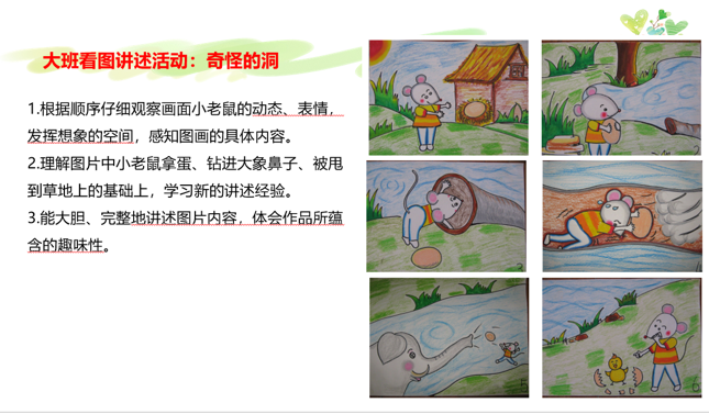 “逆向”的教学设计,是本节课的教学亮点,谷老师把结果作为起点,去寻找变化的“条件”,谷老师打开了学生多向性思维的可能性。课堂开始时,谷老师并没有直接教给学生看图讲述的方法,而是先给出看图讲述“奇怪的洞”的图片,并让同学们试着通过观察图片,并讲述图片的内容。在学生首次进行讲述时,难免会出现讲述不全面、讲述不细致的情况,大多数学生的线性描述是根据“时间”的发展演进。谷老师还请不同的学生讲述同一幅图片,使得学生在比较的过程中发现别人讲述的优点,反思自身在讲述中的不足,而这种对比也会更能够激发学生参与讲述的热情,学生也正是在这种试讲练习中不断获得进步。