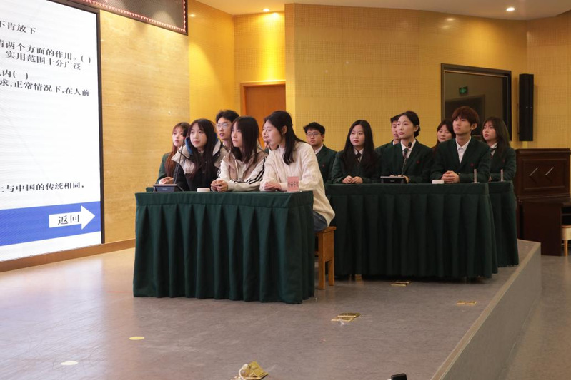 在第三轮“争分夺秒”环节中,答题前主持人随机从礼仪知识题库中抽取一道题目进行提问,主持人读题完毕宣布开始后,各学院利用抢答器抢答。各参赛队伍积极抢答,现场氛围十分激烈。