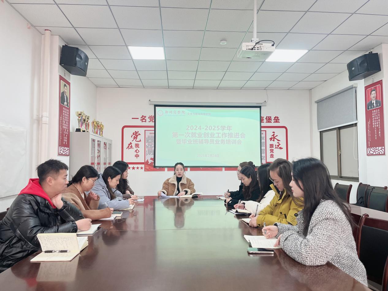 为深入贯彻落实学校就业创业工作部署要求,切实提升就业工作质量,文传学院于2025年2月24日在自力楼101会议室召开了2024-2025学年第一次就业创业工作推进会暨毕业班辅导员业务培训会。学院党委书记贾蓓及全体毕业班辅导员参加了会议。