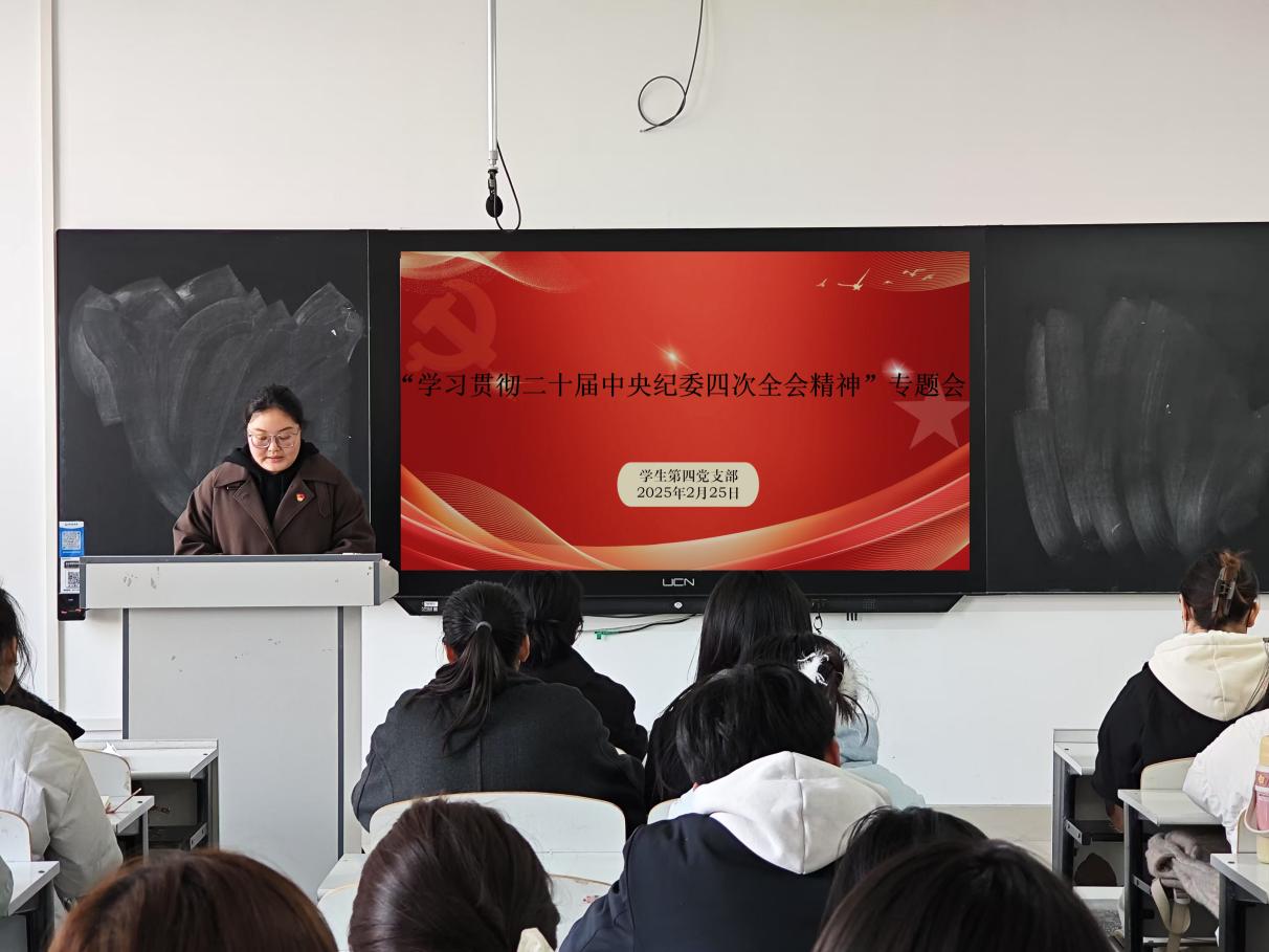 为深入学习贯彻习近平总书记在二十届中央纪委四次全会上的重要讲话精神,进一步加强学生党员的思想政治教育,提升党员的纪律意识和廉洁意识,文传学院学生第四党支部于2月25日在自力楼213召开2月份理论专题学习会。