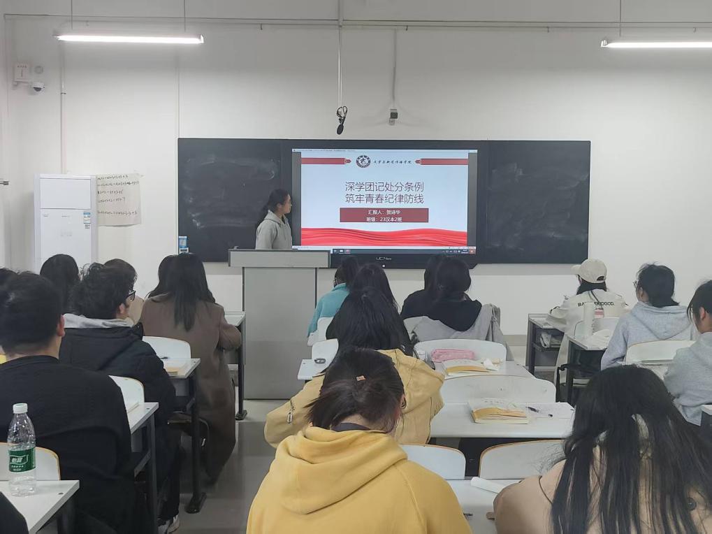 首先,由班级团支书对《中国共产主义青年团纪律处分条例(试行)》进行了全面而深入地解读,确保每位团员都能深刻领会团纪的精神实质和具体要求。《中国共产主义青年团纪律处分条例(试行)》是新时代加强团员教育管理工作的基本规范,它广泛总结吸收了近年来全团的实践探索和创新成果,对团员教育管理的内容、方式、程序等作出了明确规定。