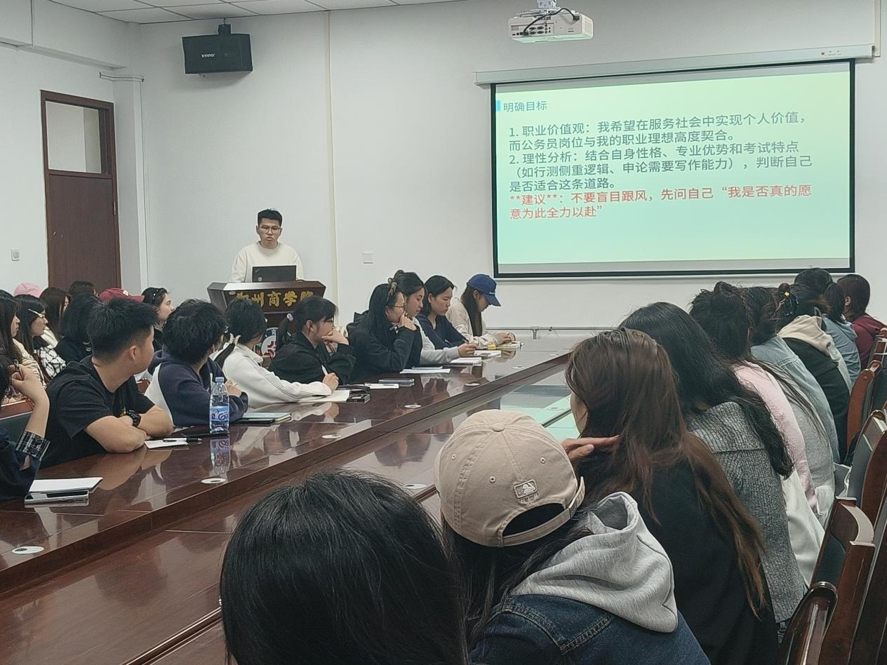 为了帮助我院学子系统掌握选调生考试政策、应试技巧与备考策略,3月26日,我院于自力楼216会议室举办“选调之路,筑梦未来”——25届优秀学生代表考公经验分享会,本次分享会特邀我院25届毕业生魏尧担任主讲人,我院就业专员晋梦珂老师主持。