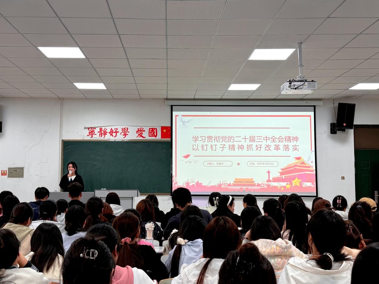 党课第三讲由我院学生第七党支部书记张明月老师主讲,她以“学习贯彻党的二十届三中全会精神 以钉钉子精神抓好改革落实”为主题,从“挺膺担当 躬身力行”“真抓实干 勤政为民”“锐意进取 奋楫笃行”三个方面展开了讲述,通过课堂交流、表演及问答等多种形式,使课堂讲解更加深入。她鼓励学员们将党课所学转化为实际行动,以更高的标准严格要求自己,不断提升政治觉悟和理论水平。