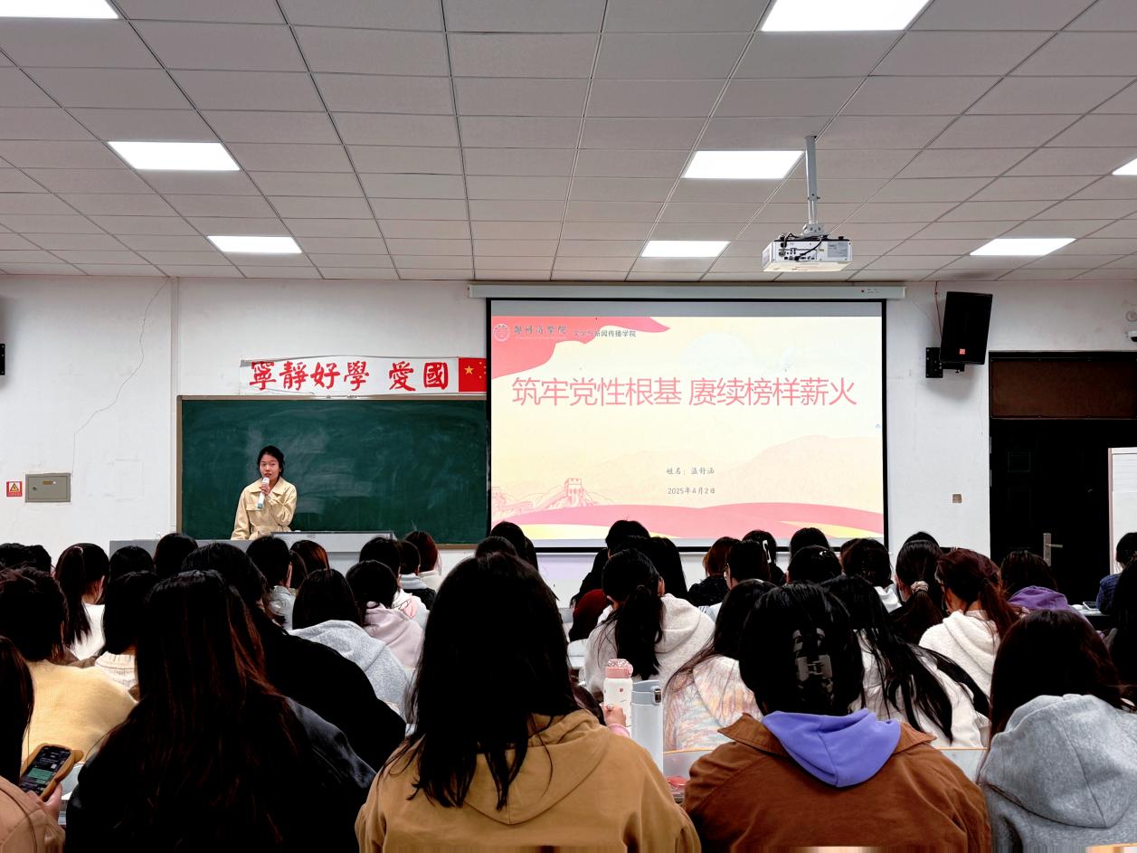 党课第四讲由我院学生第六党支部书记温舒涵老师主讲,她以“筑牢党性根基,赓续榜样薪火”为主题,从“党性修养的内涵”“优秀共产党员榜样”“如何加强党性修养”三个方面展开讲述,她通过对党性理论的深入解读,结合榜样事迹学习,引导全体学员坚定理想信念,增强党性意识,进一步深化了对榜样精神的理解,他们表示今后将在学习和生活中发挥先锋模范作用。