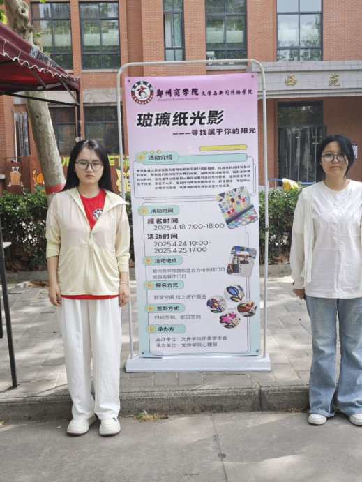 为了帮助同学们回归内心的宁静,同时促进同学们心理健康的全面发展,我院心理部于4月24日-25日在西苑餐厅门口举办了为期两天的“玻璃纸光影—寻找属于你的阳光”趣味心理活动。这场活动不仅仅是体验趣味手工的乐园,更是一场同学们发现青春光影,体会内心感悟的旅程。