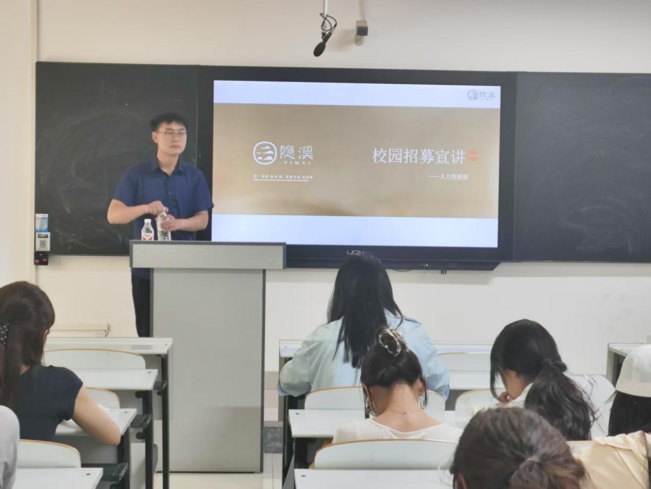 隐溪茶馆品牌负责人对品牌发展历程及茶文化传承脉络进行阐述,结合传统中式美学与现代生活方式,深度解读“静与慢”的精神内核,并围绕“以茶会友,以境养心”的核心理念,详细介绍了融合空间运营、文化体验、定制服务为一体的特色运营模式。随后,品牌负责人给同学们介绍了隐溪茶馆的工作环境、薪资待遇和福利,鼓励同学们到茶馆工作,丰富提升自我,迎接美好未来。