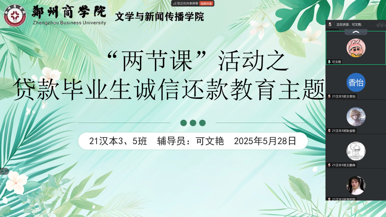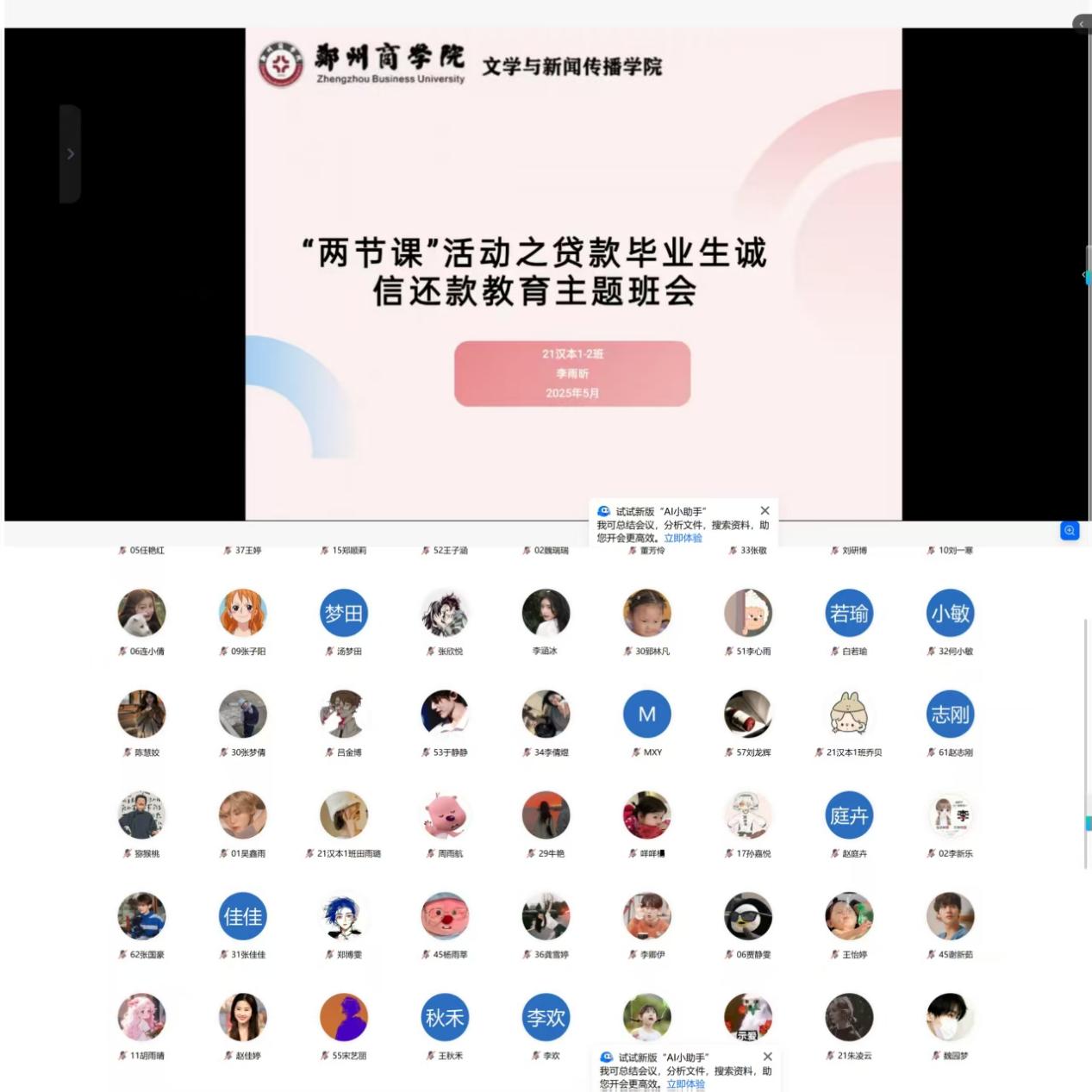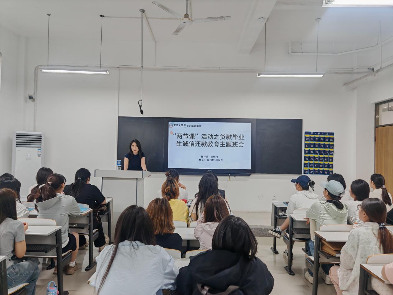 为切实增强我院国家助学贷款毕业生的诚信意识和履约责任感,深化资助育人成效,保障贷款毕业生顺利开启人生新篇章,文传学院于近期精心组织召开了国家助学贷款毕业生诚信还款教育主题班会。本次班会是落实学校“资助两节课”工作的重要环节,旨在为即将离校的贷款学子们上好金融信用“最后一课”。