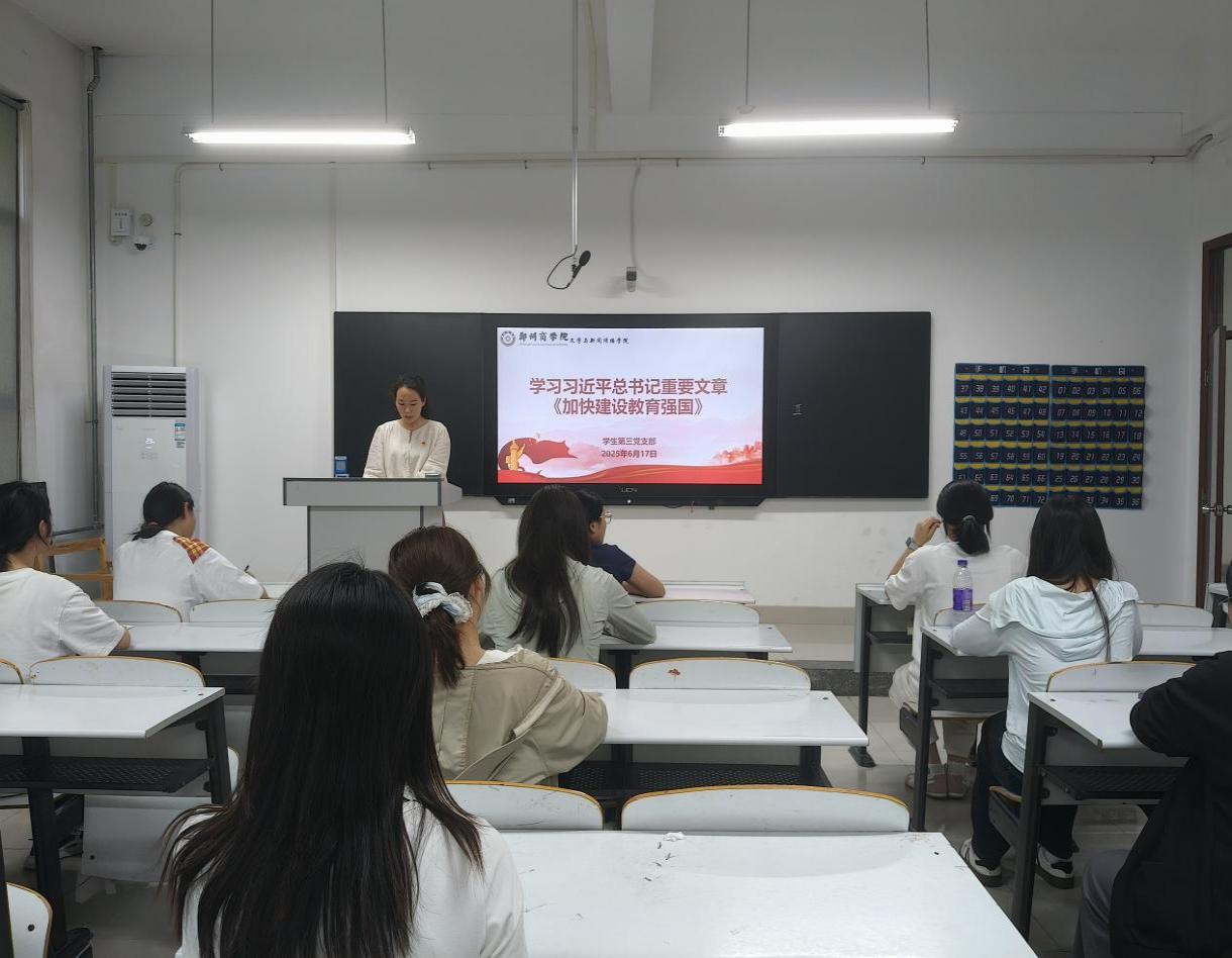 为深入学习贯彻习近平总书记重要讲话精神,加强对青年学生的思想政治教育、强化青年使命担当,文传学院学生第三党支部于2025年6月18日在自力楼205教室组织召开专题理论学习会,集中学习习近平总书记重要文章《加快建设教育强国》。本次会议由支部书记杨园园老师主持,支部全体党员和积极分子参与本次会议。
