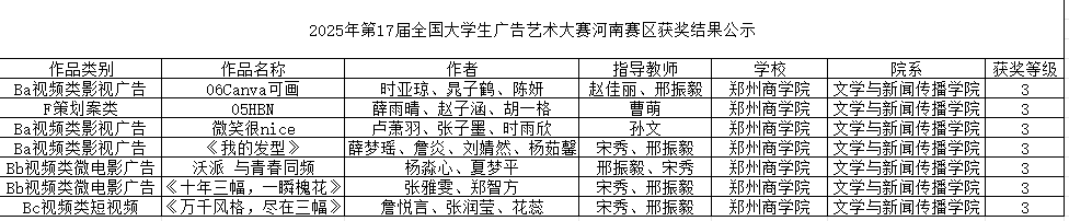 在2025年第17届全国大学生广告艺术大赛(简称“大广赛”)河南赛区中,点点官网学子凭借独特的创意和精湛的制作实力,从众多高校中脱颖而出,斩获7项大奖,再次展现了文传学院广告教育的硬核实力与青春风采!