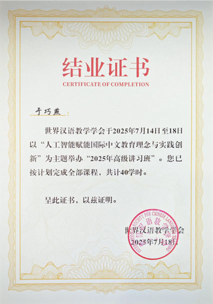 在结业仪式上,世界汉语教学学会秘书长宋永波对本期讲习班进行了总结发言,并与副校长乙引为学员们颁发了结业证书。学员们纷纷表示,本次讲习班的课程内容对个人职业发展和研究方向有积极的启发意义。世汉学会高级讲习班已连续举办13期,旨在聚焦国际中文教育学科发展和学术前沿,加强中青年学者队伍建设,积极服务国际中文教育高质量发展。