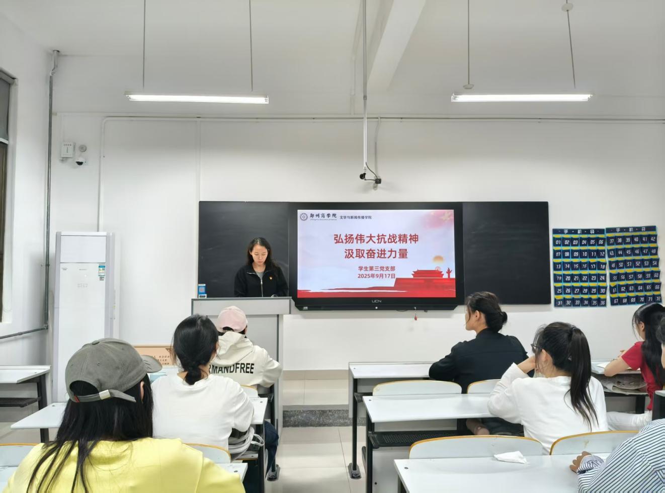 为传承红色基因、弘扬伟大抗战精神,引导党员从历史中汲取奋进力量,2025年9月17日,文传学院学生第三党支部于自力楼204教室组织开展“弘扬伟大抗战精神,汲取奋进力量”主题党日活动,推动党员在新时代传承抗战精神,勇担使命。