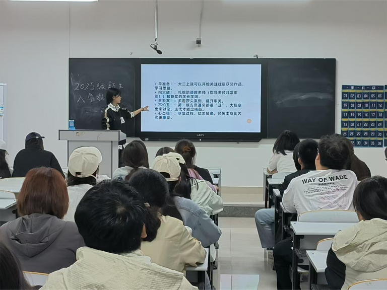 孙文与宋秀两位老师围绕专业竞赛展开讲解,重点介绍了全国大学生广告艺术大赛、中国大学生广告艺术节等赛事情况,引导学生深入了解本专业相关的专业竞赛。并结合历年优秀作品,详细剖析了不同类别作品的创作要点,让新生对竞赛有更直观且全面的认识。在讲座最后,通过邀请往年获奖学生代表参与到讲座中,在讲座现场与新生分享参赛心得与备赛经验,帮助新生全面认识学科竞赛在提升综合素质、拓展专业视野中的重要意义。