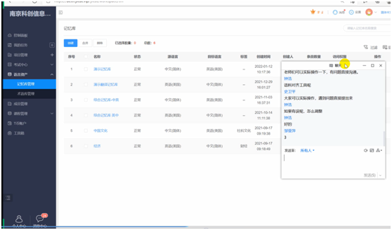 随后,宋江文经理细心地指导大家利用Yicat平台建立翻译项目、设置记忆库和术语库、开展译后编辑等流程性操作,指导教师如何建立项目组、如何管理学生的项目、以及如何批改学生的译文等。宋老师讲解时让老师和学生边听边练,一一回复了老师和学生们的提问,培训活动井然有序,在线互动积极高效。
