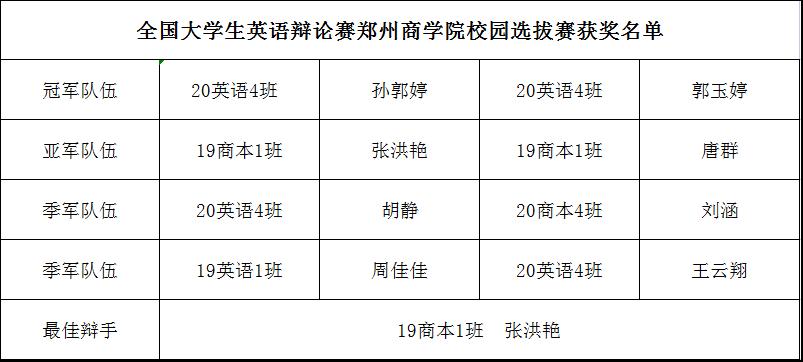 比赛最终决出校园选拔赛冠军队伍1支、亚军队伍1支、季军队伍2支,最佳辩手1名,其中冠军队伍将代表点点官网参加4月份举行的全国大学生英语辩论赛华西地区赛。获奖名单如下:
