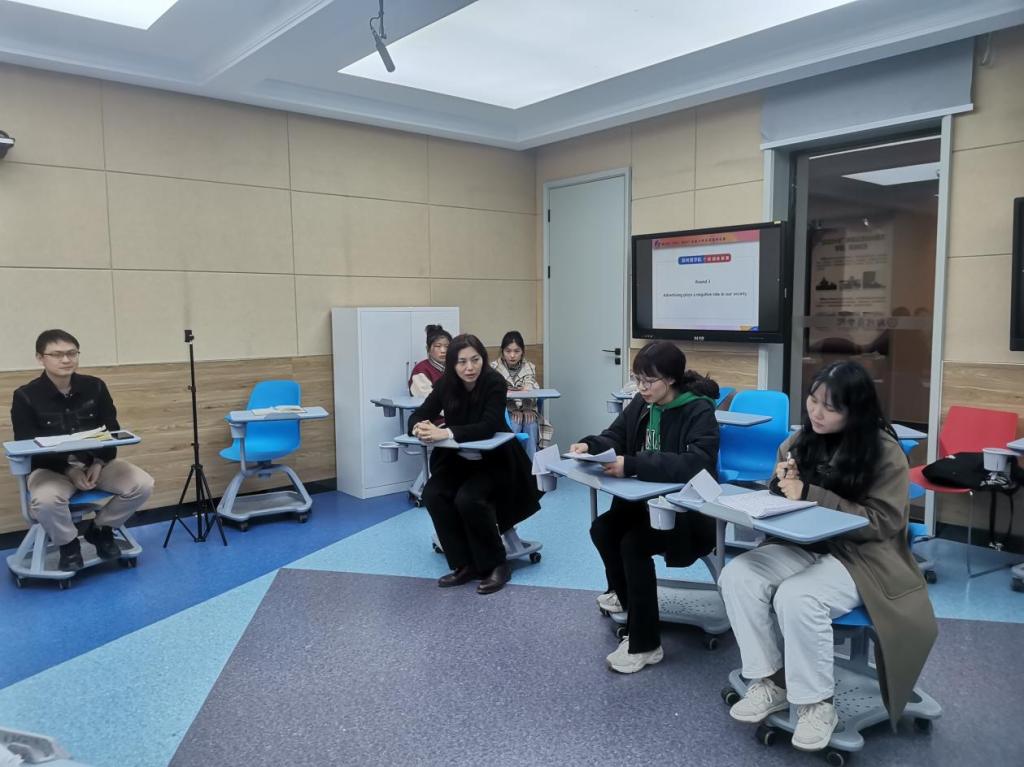 为引导全校广大青年学生积极践行社会主义核心价值观,加强校园文化建设,帮助学生开拓国际视野、提升英语表达和思辨能力,培养兼具家国情怀和全球视野的国际沟通与传播人才,选拔高质量拔尖人才,积极备赛第24届“外研社·国才杯”全国大学生英语辩论赛,外国语学院于3月17日下午,在商务外语实验中心智慧教室举行全国大学生英语辩论赛taptap点点校园选拔赛决赛。外国语学院王勃院长、韩笑、韩浩、徐浩和郭彪老师担任决赛评委。