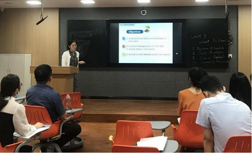 为使新进教师尽快进入教师角色、上好新学期第一堂课,8月23日下午,我院在外语楼108开展了新学期外国语学院师资培养系列之教学示范课活动。本次活动特邀商务英语教研室主任葛莹辉、英语专业教研室教师陈爱菊做示范课,全体新入职教师进行观摩。