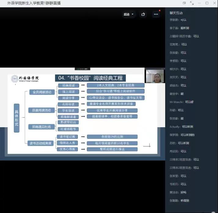 为落实立德树人根本任务,进一步帮助新生了解学校的相关制度和政策,更好地适应大学校园生活,9月23日外语学院开展了线上2022级新生入学教育。