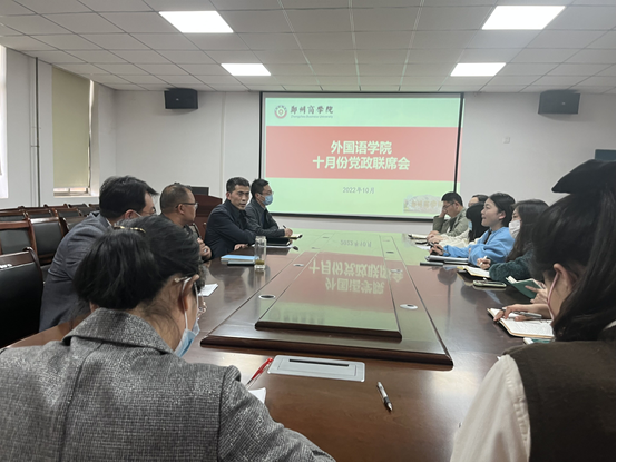10月27日下午,外国语学院在W209会议室召开2022年10月份党政联席会议,集体学习和讨论习近平总书记在中国共产党第二十次全国代表大会上的报告。外国语学院党委书记王克志、院长邱培磊、副院长赵保成,各教研室主任及全体辅导员老师出席会议。