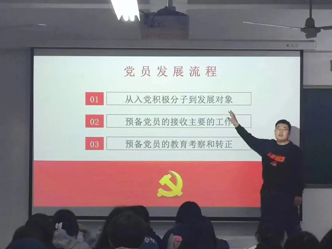 会议伊始,丁震霆老师向入党积极分子介绍了中国共产党的中心任务,引导入党积极分子厚植爱党、爱国、爱社会主义的情感,努力成为社会主义建设者和接班人,让红色基因、革命薪火代代相传。随后,丁震霆老师勉励积极分子们要端正入党态度,虚心接受党组织的教育、培养和考察,以实际行动争取早日加入党组织。最后,丁震霆老师对积极分子提出一下三点要求:一是要忠于信仰。要传承弘扬伟大建党精神,筑牢信仰之基、补足精神之钙、把稳思想之舵,加强对习近平新时代中国特色社会主义思想的学习,在理论滋养中改造思想、坚定信念。二是要切实发挥先锋模范作用。学习上要刻苦争先,生活中勤俭节约,科学安排时间。工作上要做好老师的帮手,尽职尽责,争先创优。三是要弘扬伟大斗争精神。敢于和各种不良现象作斗争,带头贯彻落实学校关于疫情防控的各项决策部署,共同创建和维护安全、和谐、文明校园。