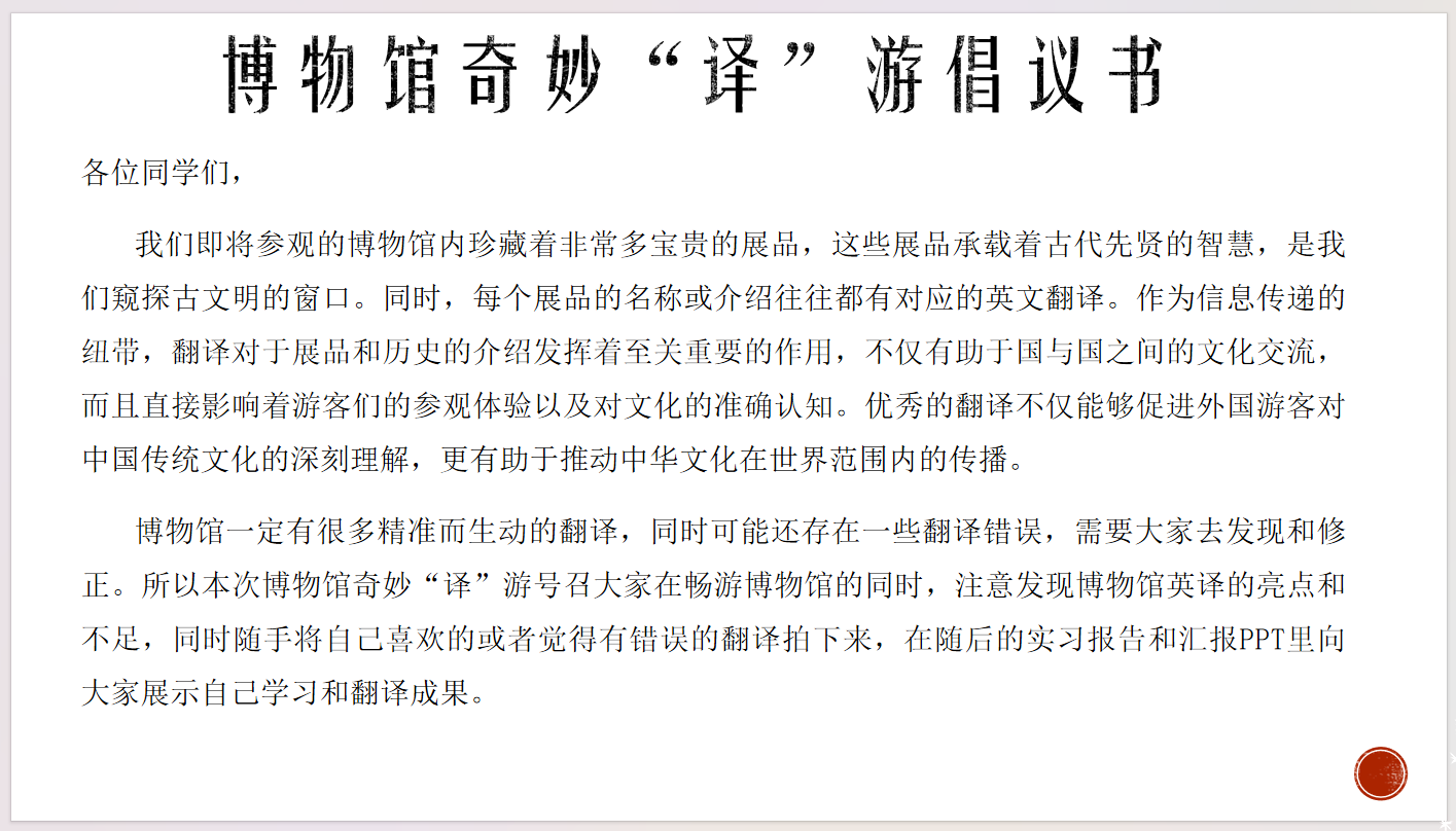 随后,实习负责老师别韶冰老师为同学们介绍了认识实习详细的安排,包括认识实习的主题——“博物馆奇妙译游”、认识实习地点、交通方式、认识实习参观路线和时间表、认识实习倡议书、注意事项、以及认识实习的关注点等内容。为同学们提供了详细的参观指南,让同学们对即将进行的认识实习有了清晰的了解,也增添了对实习的热情。