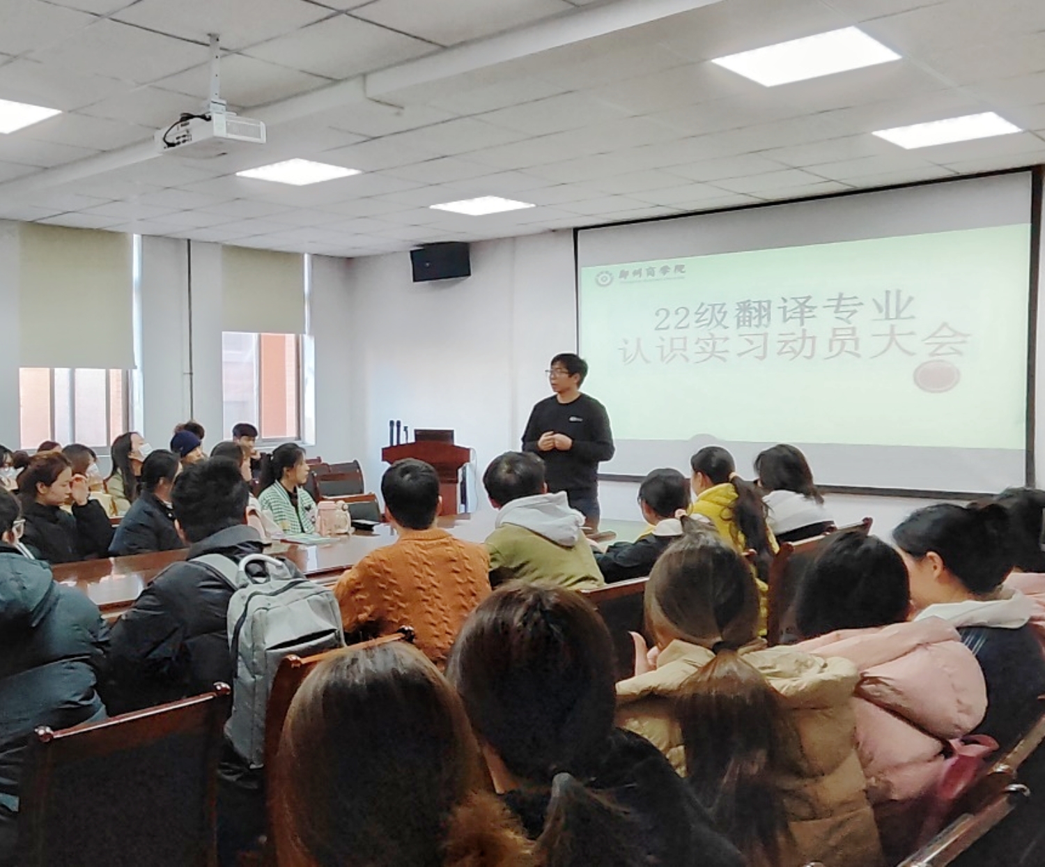 为落实应用型人才培养理念,拓宽学生在中国文化翻译方面的知识面,进而为职业发展规划奠定意识基础,11月30日,我院翻译专业在W209会议室召开认识实习动员会。翻译专业教研室主任郜万伟、认识实习负责教师别韶冰、就业专员兰敬高等出席本次启动会,2022级翻译专业全体学生参加此次会议。