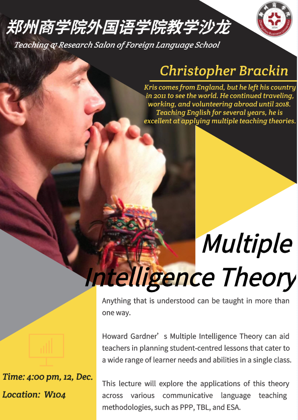霍华德·加德纳的多重智能理论可以帮助教师规划以学生为中心的课程,以满足单一课程中学习者的广泛需求和能力。它还能让学生利用他们的个人优势和偏好,促进自我表达和改善他们的学习经验。本次教学沙龙将探讨这一理论在各种交际语言教学方法中的应用,如PPP、TBL和ESA。欢迎全校教师踊跃报名参加,共同研讨、一起交流。