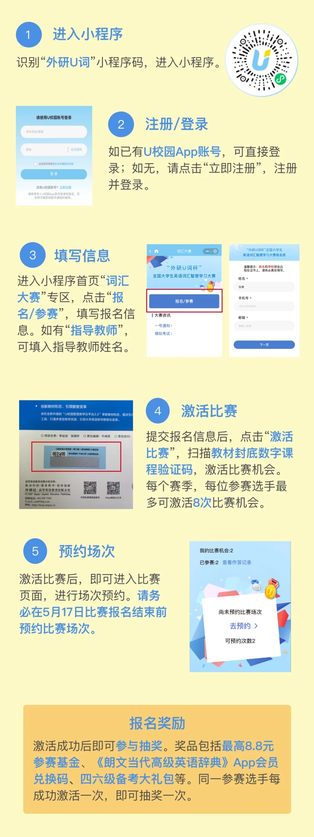 大赛依托“外研U词”微信小程序举办。本次大赛为公益赛事,不收取报名费。有意参赛的学生可按照以下步骤自主报名。