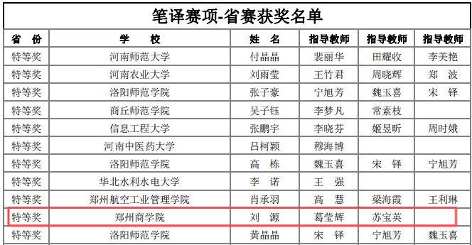 11月8日,2024全国大学生外语能力大赛——综合能力赛项及笔译赛项省赛获奖名单公布。我院7名学子在比赛中脱颖而出,其中我院21英语1班王皓琨荣获综合能力赛项特等奖,21商本1班刘源荣获笔译赛项特等奖,晋级国赛。
