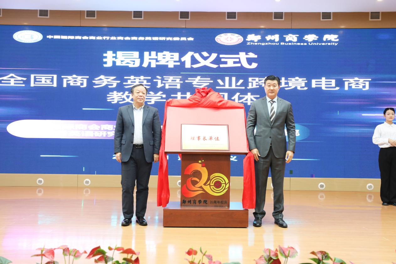 随后,吴泽强校长与中国国际商会商业行业商会商务英语研究委员会秘书长佟敏强教授为全国商务英语专业跨境电商教学共同体揭牌。