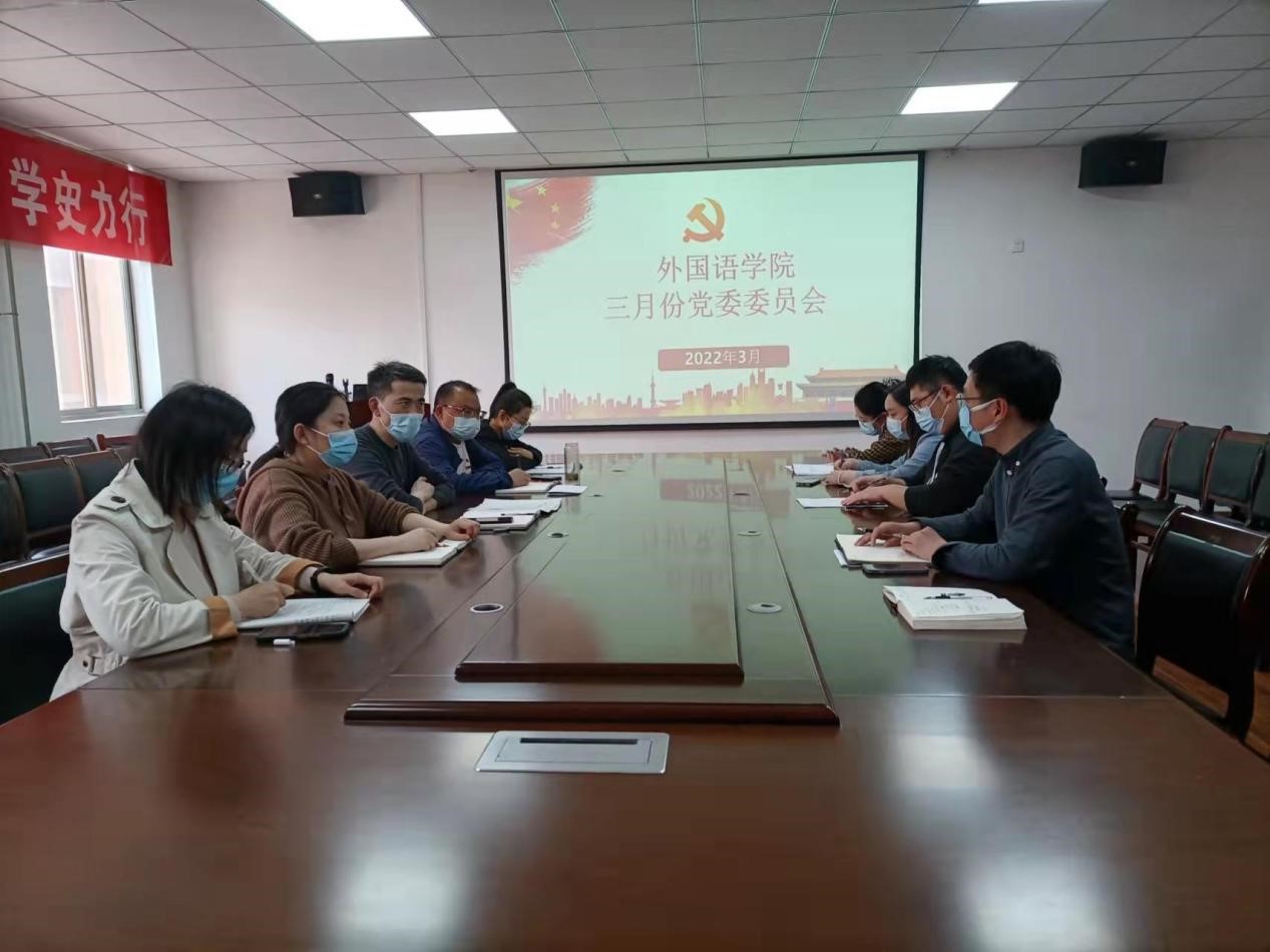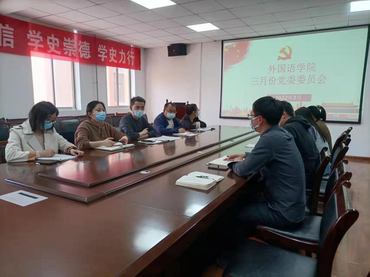 3月31日下午,外国语学院召开2022年3月份党委会会议专题研究疫情防控、意识形态、能力作风建设和34期积极分子发展等内容。学院党政班子成员、各党支部负责人参加会议。会议由党委书记王克志主持。