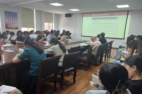 为深入贯彻落实习近平总书记关于加强党的纪律建设的重要论述,认真落实党中央关于开展党纪学习教育的部署要求,推进党纪学习教育走深走实,切实增强党员的纪律意识和规矩意识。5月30日,外语学院党委邀请通识教育中心邢克鑫教授以《恪守党的纪律,筑牢思想防线》为题为全体教师党员讲授党纪学习教育专题党课,学院全体教师党员参加本次专题党课。
