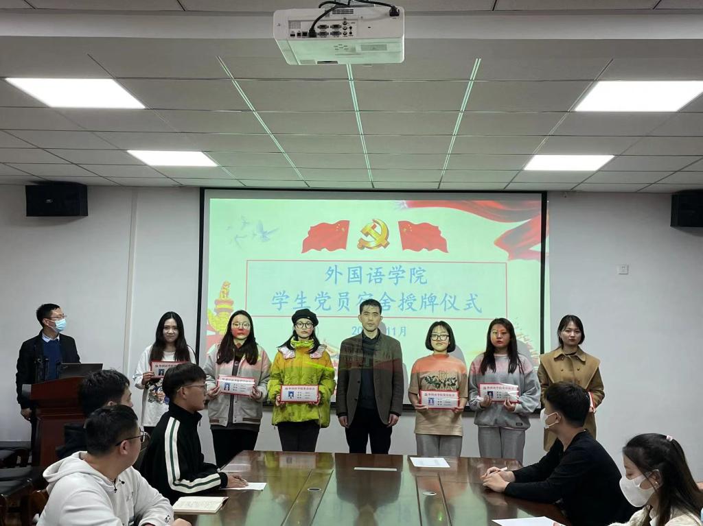 11月22日,外国语学院“学生党员宿舍”授牌仪式举行。外国语学院党委书记王克志为宿舍授牌,并与学生党员代表座谈。学院组织委员兰敬高、支部书记丁震霆、新闻宣传负责人刘宁老师参加。