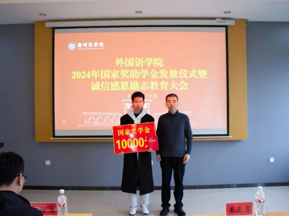 会议伊始,兰敬高老师为同学们介绍了国家奖助学金的资助政策,并就国家奖助学金的目的和意义作出了基本的解读。随后,国家奖学金和国家励志奖学金的获得者高浩楠和刘思念同学分别作出学习经验分享。他们在发言中提到,要努力学习,积极参加校内外的活动比赛,考取各种等级证书,尽全力提升自我,为母校和祖国增光添彩。接着,进行奖助学金的发放仪式,我院党委书记王克志、团委书记王子浩及各辅导员老师分别向获得国家奖助学金的学生代表颁发奖牌并合影留念。