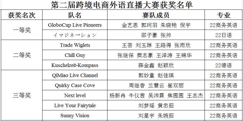 经过激烈角逐,商务英语专业GloboCup Live Pioneers赛队与日语专业イマジネーション赛队双双拿下一等奖。获奖选手名单如下: